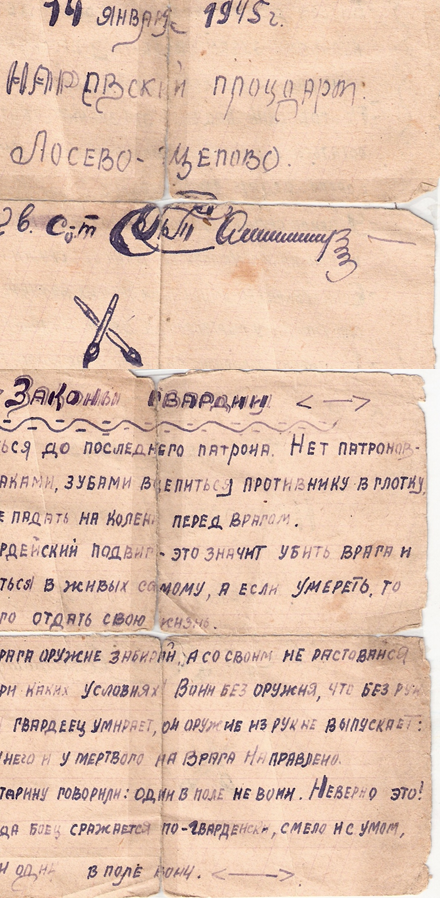 ![]() Самсонов Павел Титович Павел Титович родился в деревне Хожайнова Болховского района Орловской области. До войны закончил 7 классов. В начале войны забрали на фронт отца. В 1941 году деревню захватили немцы. Все их бесчинства проходили на его глазах. В 1943 году, когда советские войска освободили деревню от фашистов, его забрали на фронт, ему было 17 лет. Отец пропал без вести, а ему пришлось воевать на Курской дуге, освобождать Польшу в армии под командованием маршала Рокоссовского. После победы над Германией, был отправлен в Корею на войну с Японией. Награды: медаль «За боевые заслуги», медаль «За освобождение Варшавы», медаль «За освобождение Кореи», медаль «За победу над Германией», юбилейные медали. ![]() Семьи на Руси были большие и дружные. Уважали старость, оберегали младость. Вокруг каждого из нас много родных (бабушек, дедушек, прабабушек). С ними мы неразрывно связаны нитями. Наши предки, наши корни – наша родословная. В жизни, как и в природе всё взаимосвязано. Если погибнут корни, погибнет и дерево. Если мы забудем дедов и прадедов – мы истощимся духовно. Тот род силён, который предков своих помнит и чтит. Я задумалась над последними словами и решила составить своё древо жизни. Я расскажу сегодня об одной его ветви. Мой дедушка, Самсонов Павел Титович, в свои 15 лет оказался на территории оккупированной немцами. Он вспоминал, как фашисты убили грудного ребёнка, потому, что он долго плакал и мама не могла его успокоить. Всегда в памяти у него всплывал эпизод, как немцы подбили наш самолёт, схватили одного из лётчиков (другому удалось скрыться в лесу) и расстреляли на виду у всей деревни. Бросили его тело в овраг. Ночью, тайком, женщины похоронили лётчика, закрыли могилу дёрном, чтобы немцы не нашли это место. После освобождения деревни от фашистов, был поставлен крест на его могиле. Когда шла Курская битва, освободили город Орёл и наши войска приближались к городу Болхов, моего деда Павла Титовича, после освобождения деревни, забрали на фронт. Он воевал 88 стрелковом полку, затем в 130 гвардейском стрелковом полку миномётчиком. Дед Павел Титович воевал в армии Рокоссовского, освобождал Польшу. Был ранен. После госпиталя, был направлен на Дальний Восток. Воевал с японцами за освобождение Кореи. После войны закончил военно-авиационное училище и служил на авиационной базе механиком фотооборудования на военных самолётах. Награды: медаль «За боевые заслуги», медаль «За освобождение Варшавы», медаль «За освобождение Кореи», медаль «За победу над Германией», юбилейные медали. Мой дедушка умер давно. Мне на тот момент было 2 года, и мне очень жаль, что я его практически не помню. Но у нас сохранились его медали и Законы гвардии, которые дед писал на фронте. Дед помощника судьи Киселевского городского суда Ефимовой К.В. |